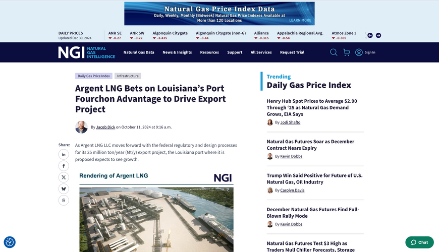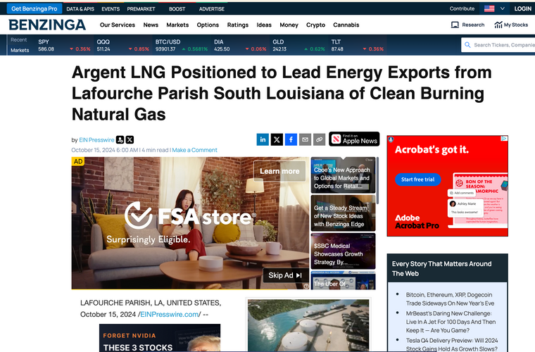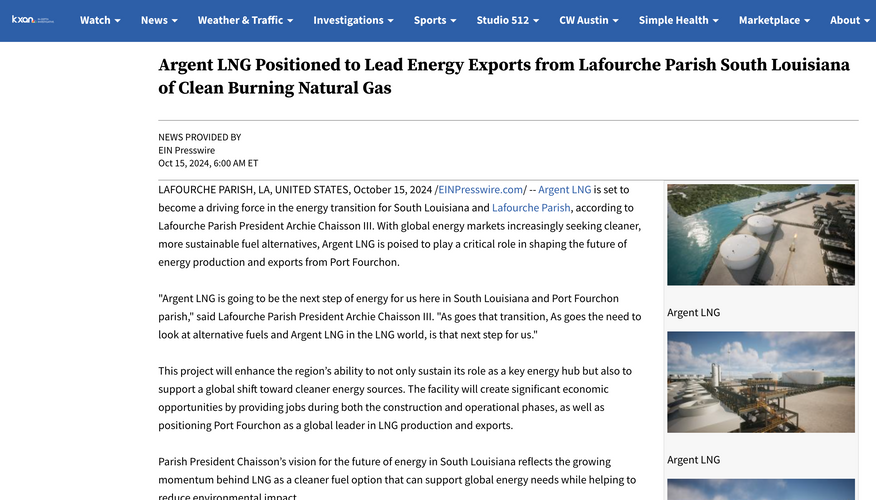 Argent LNG Positioned to Lead Energy Exports from Lafourche Parish South Louisiana of Clean Burning Natural Gas