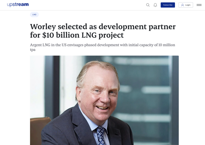 Worley selected as development partner for $10 Billion LNG project Argent LNG in the US envisages phased development with initial capacity of 10 MTPA Descriptive Title