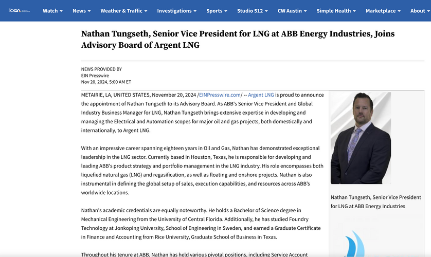 Nathan Tungseth, Senior Vice President for LNG at ABB Energy Industries, Joins Advisory Board of Argent LNG