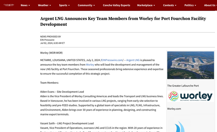 Argent LNG Announces Key Team Members from Worley for Port Fourchon Facility Development