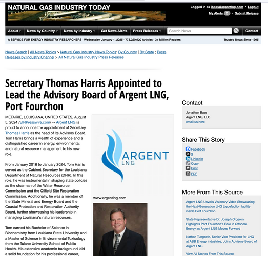 Secretary Thomas Harris Appointed to Lead the Advisory Board of Argent LNG, Port Fourchon