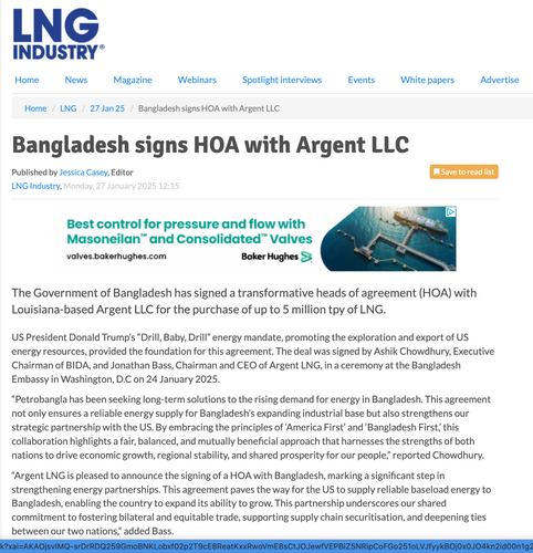 US President Donald Trump’s “Drill, Baby, Drill” energy mandate, promoting the exploration and export of US energy resources, provided the foundation for this agreement. The deal was signed by Ashik Chowdhury, Executive Chairman of BIDA, and Jonathan Bass, Chairman and CEO of Argent LNG, in a ceremony at the Bangladesh Embassy in Washington, D.C on 24 January 2025.